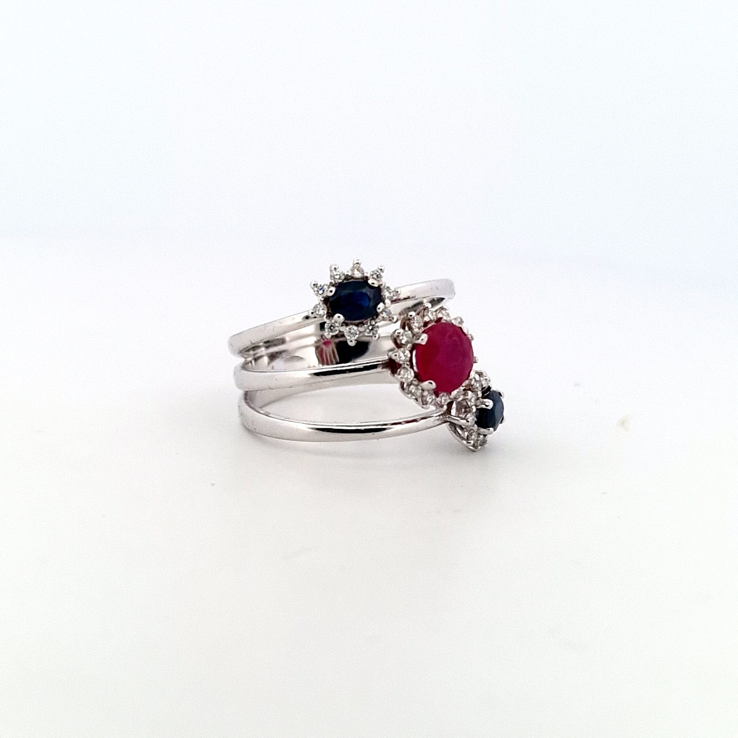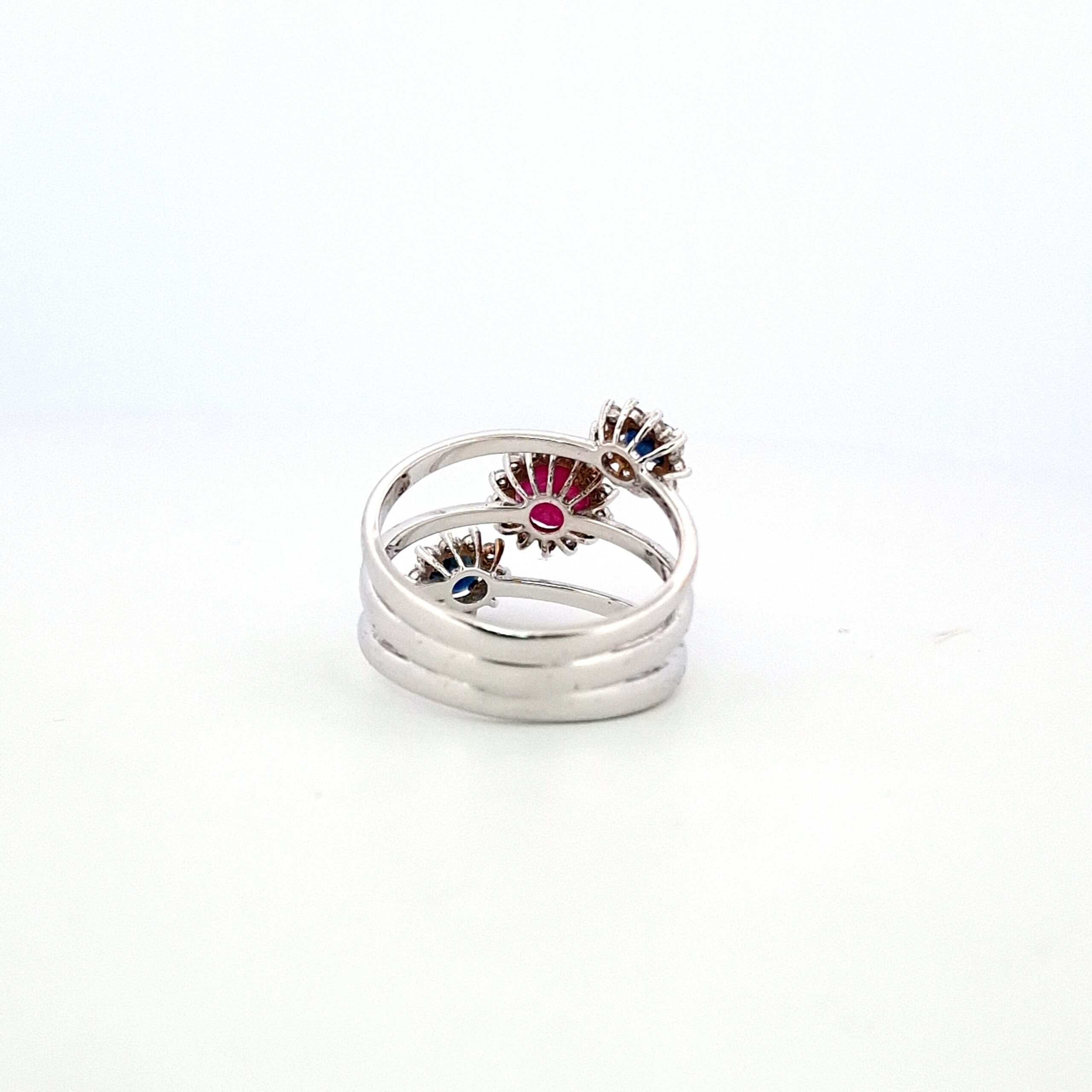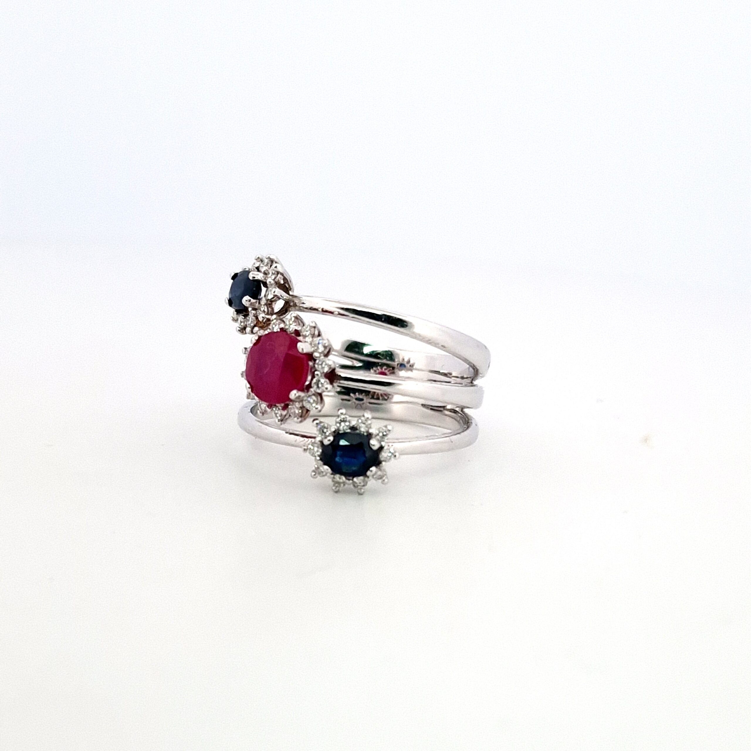 Scopri la bellezza senza tempo di questo anello in oro bianco da 18Kt, con un design sofisticato arricchito da un rubino centrale, zaffiri e diamanti scintillanti. Con un peso complessivo di 7.00 g, questo gioiello è un vero capolavoro di artigianato e stile.