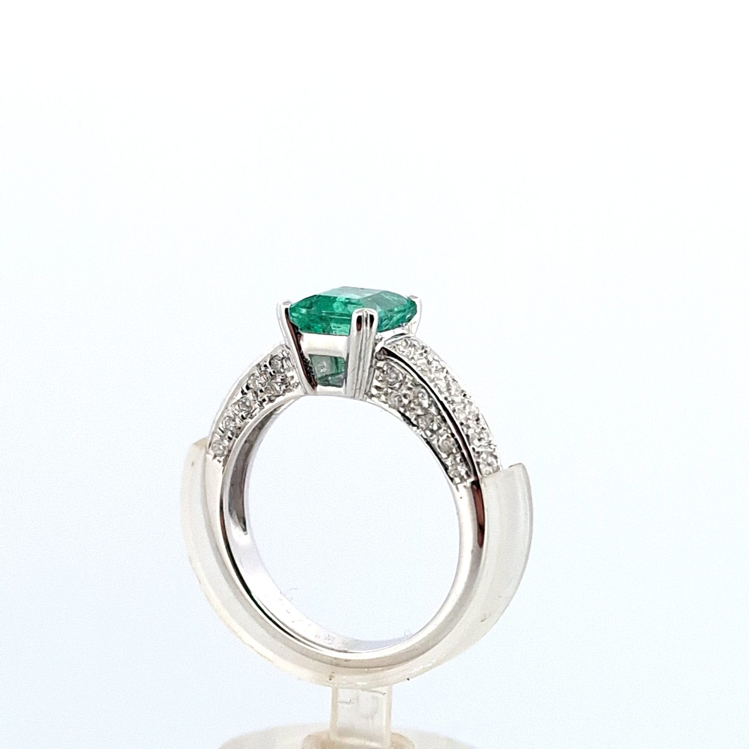 Anello in oro bianco da 18Kt con smeraldo centrale da 1.50 kt e diamanti naturali da 0.50 ct, misura italiana 16 – misura europea 56