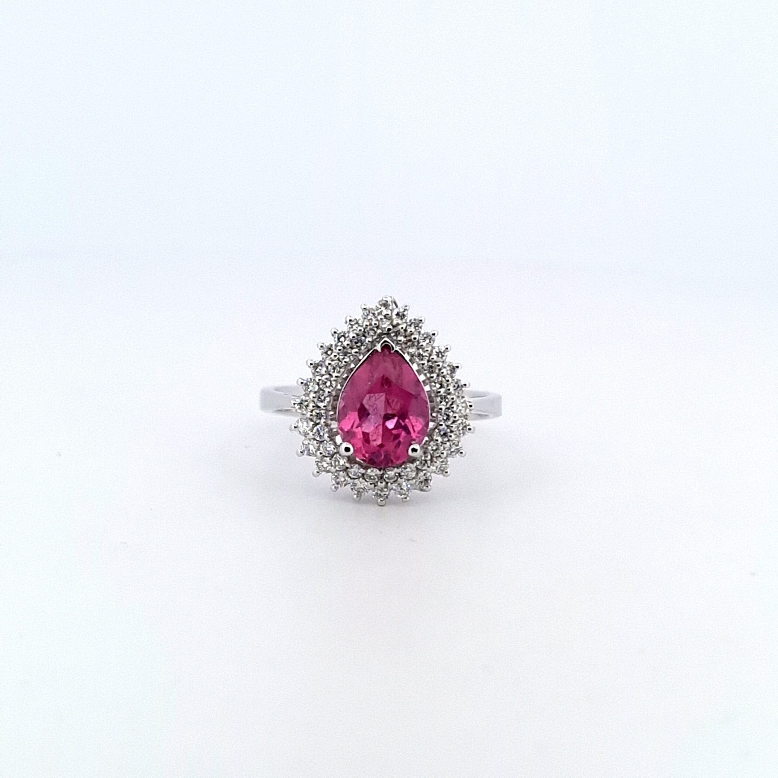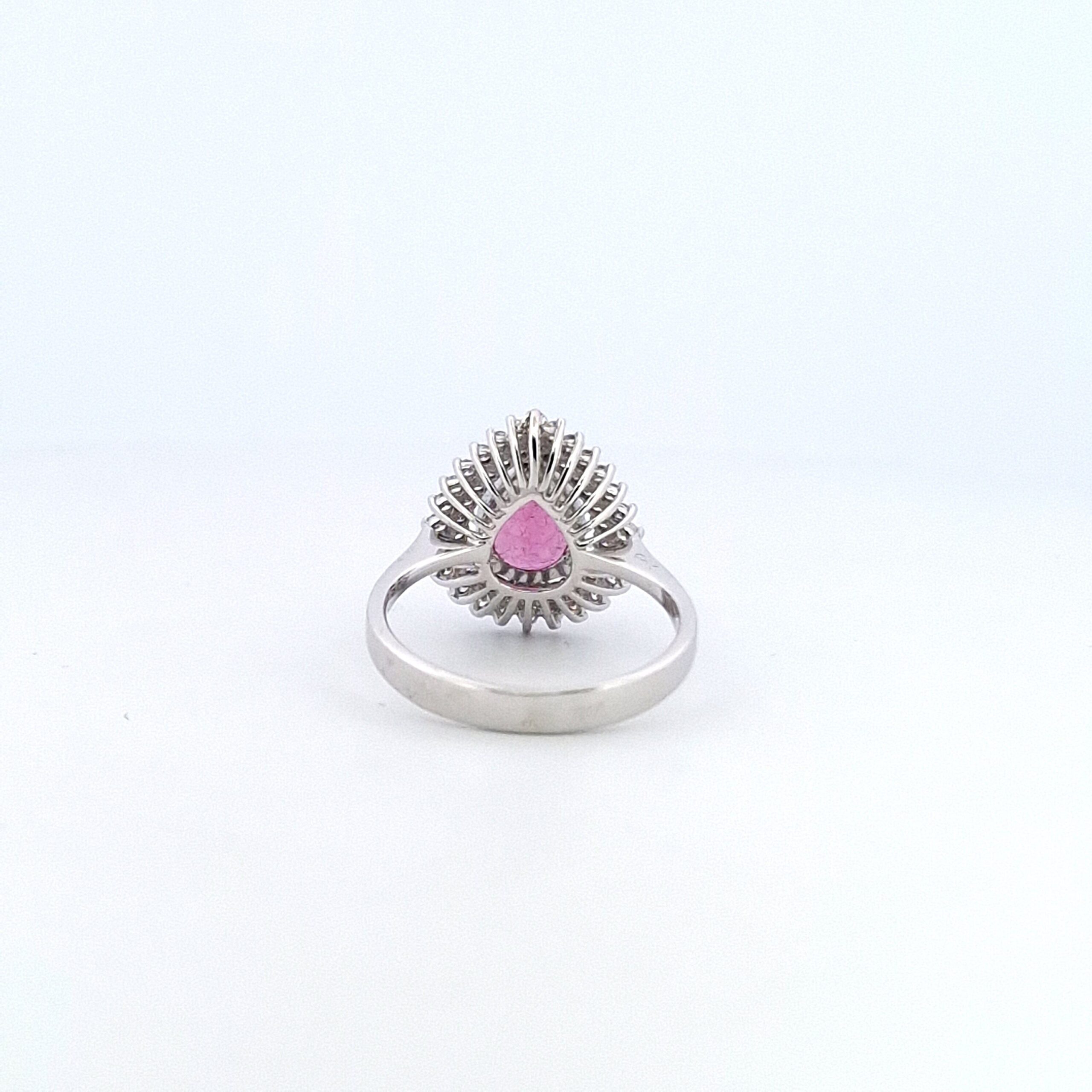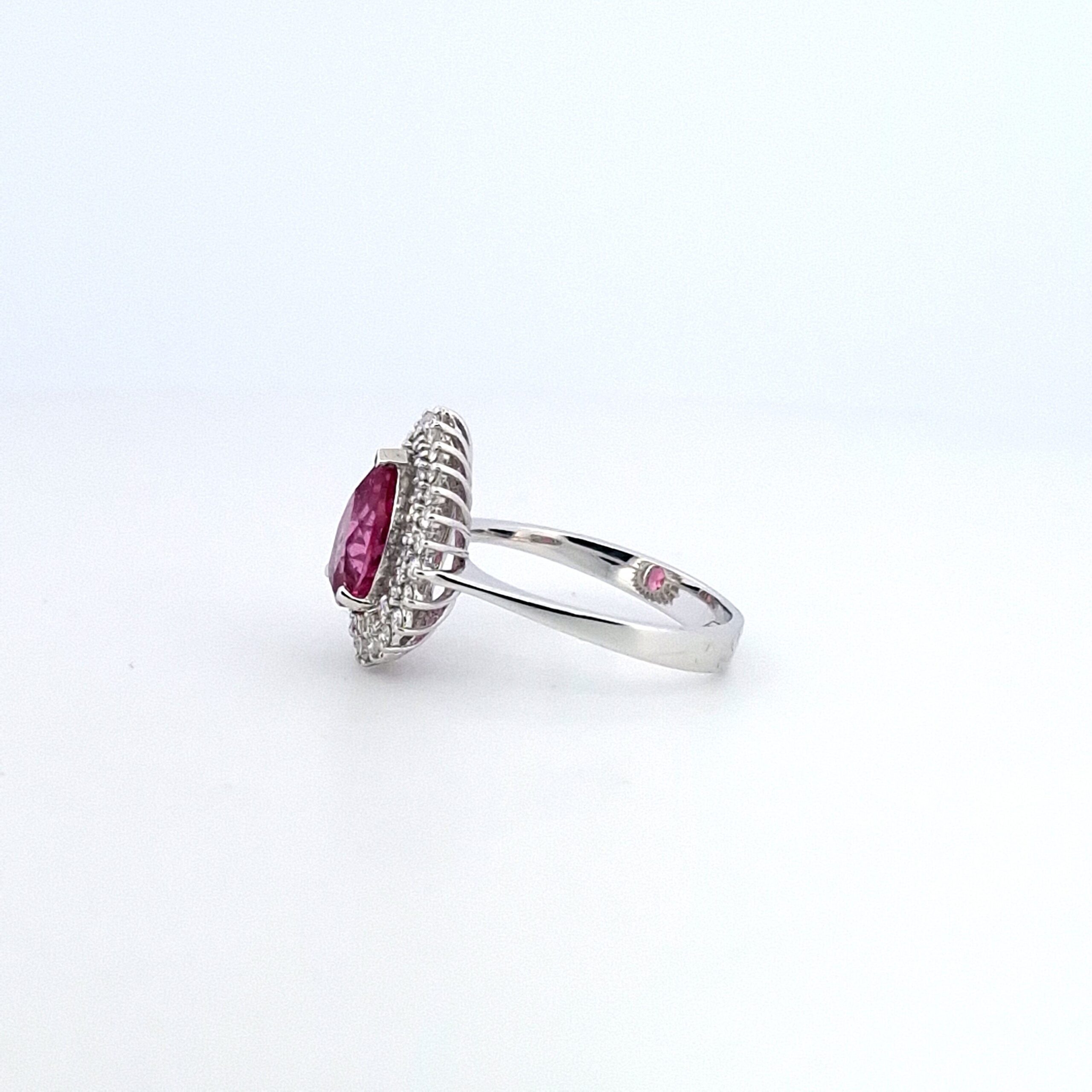 Anello in oro bianco da 18Kt con Tormalina rosa centrale e diamanti laterali dal peso totale di 0.424 ct, colore G – purità VS – Misura italiana: 15 – Misura europea: 55